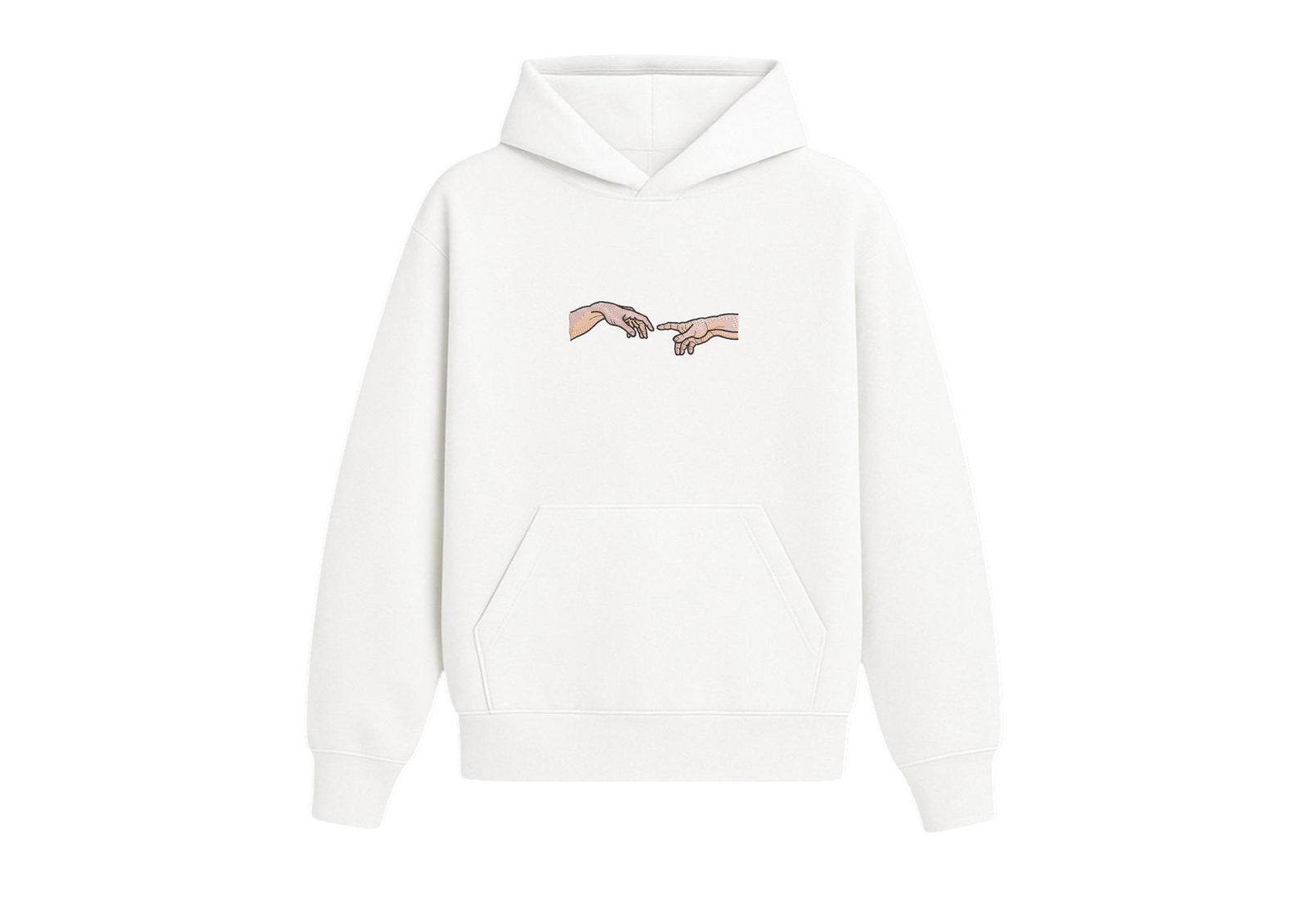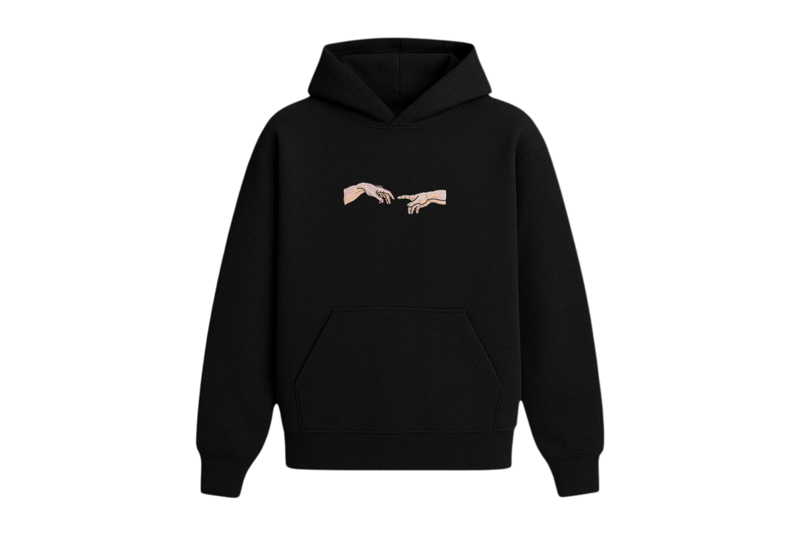 Este buzo reinterpreta uno de los gestos más icónicos de la historia del arte: las manos que se buscan, pero nunca se tocan.