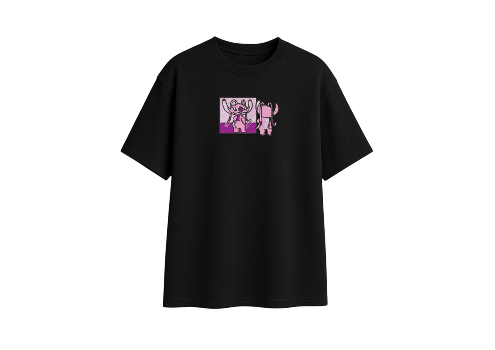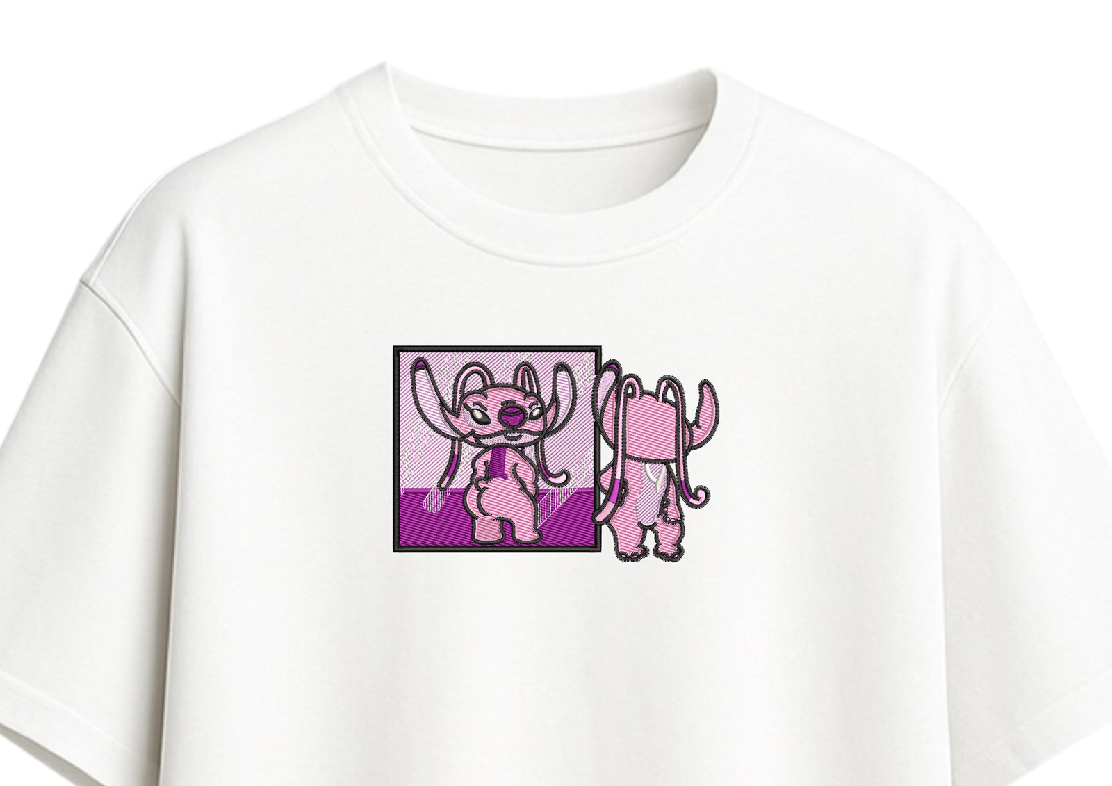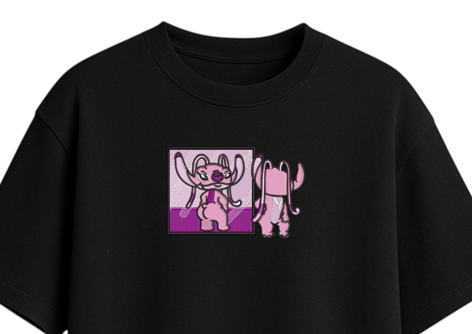 Ángela frente al espejo en un diseño lleno de actitud. Bordado premium en tonos rosa y lila que hacen de esta prenda plus para fans que buscan algo diferente.