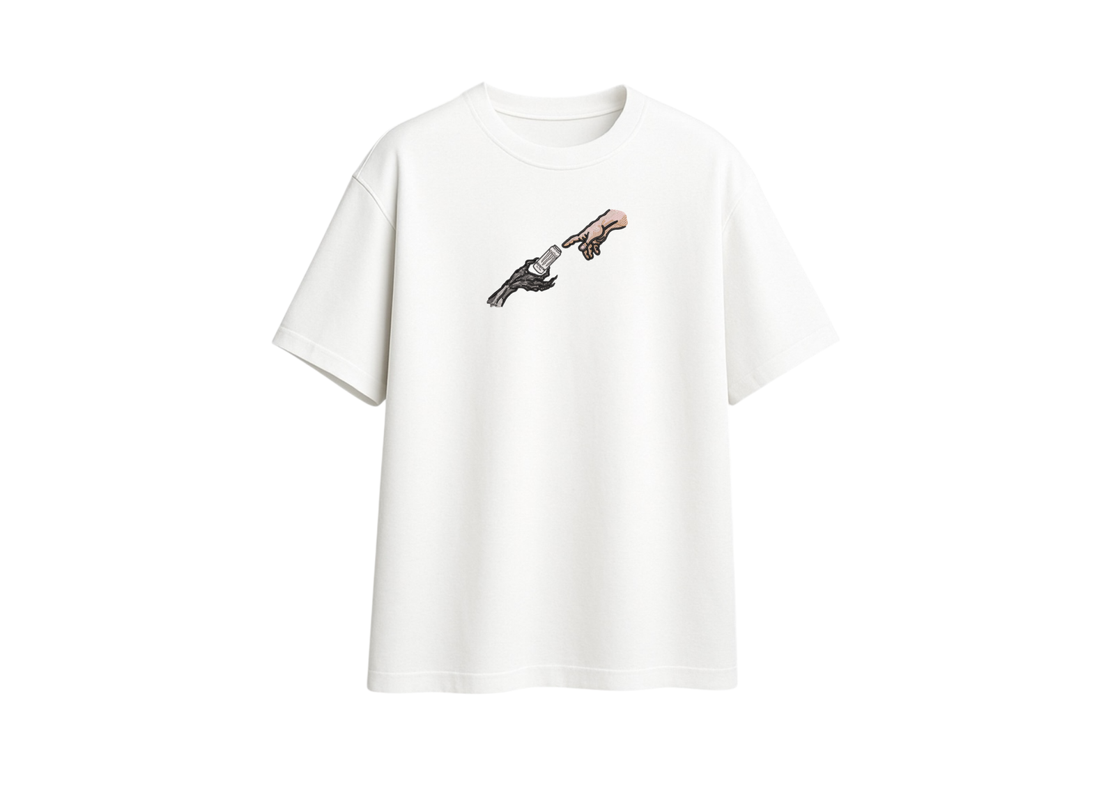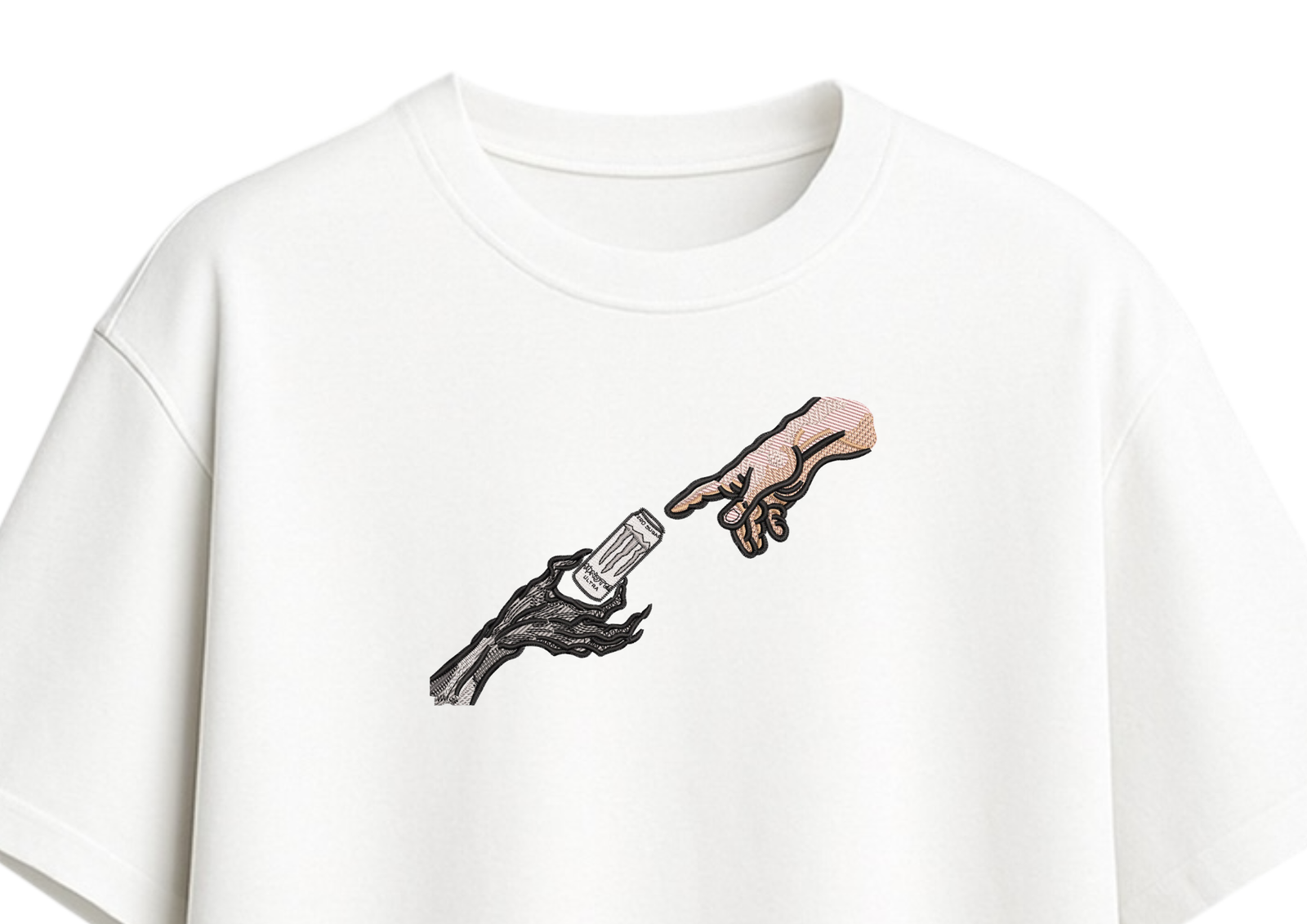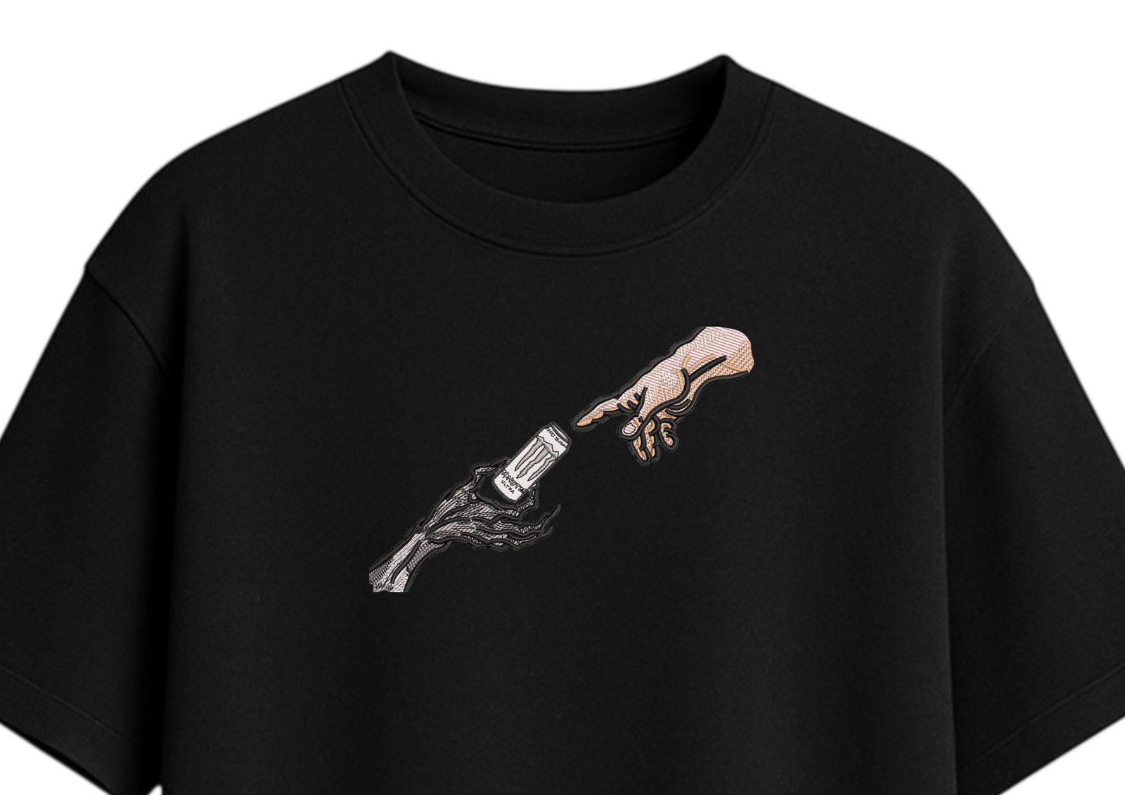 Un diseño que mezcla lo clásico con lo irreverente: la mano de lo humano y lo oscuro recibiendo algo tan cotidiano como una lata. Una sátira bordada que convierte lo simple en arte de colección.