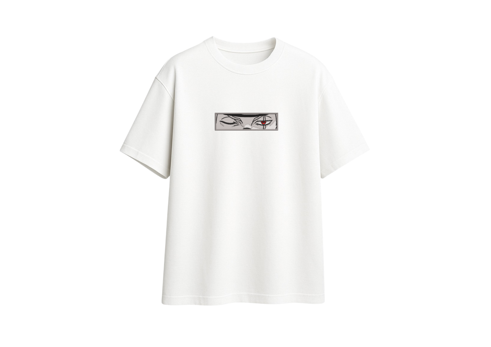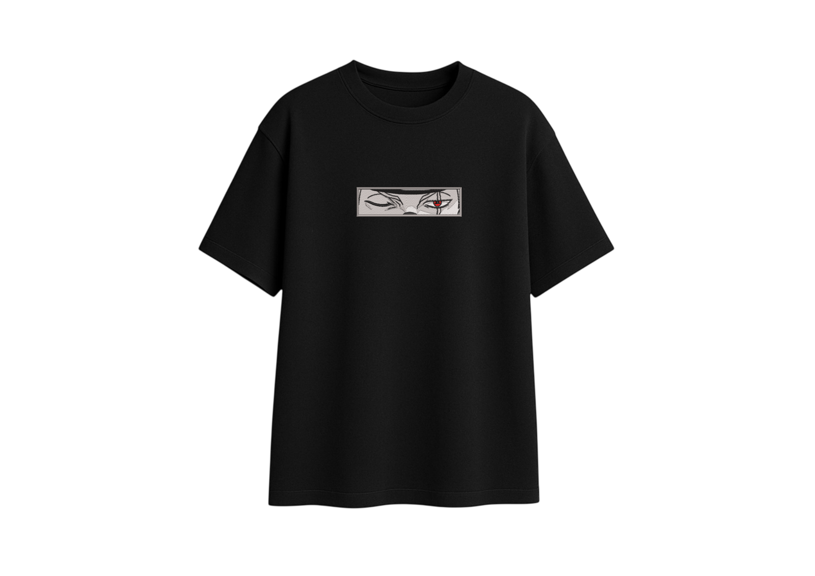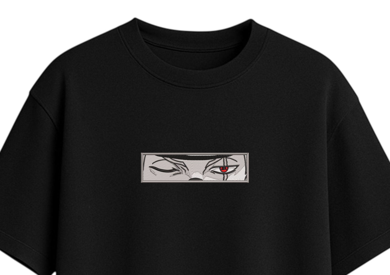 Los ojos de Kakashi, capturados en un diseño que transmite misterio y poder en un solo vistazo. La intensidad del Sharingan bordado en rojo contrasta con la serenidad del resto del diseño, creando una pieza que habla por sí sola.