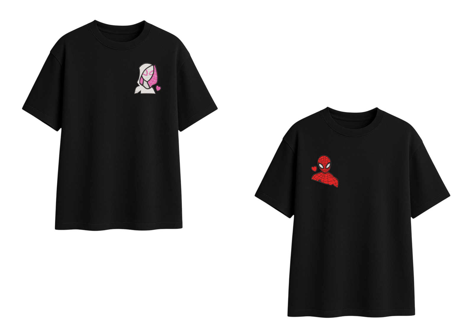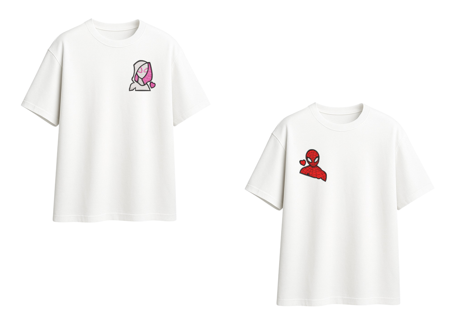 El universo arácnido también tiene su costado romántico. Este dúo une a Spider-Man y Spider-Gwen en un diseño minimalista, lleno de color y detalles bordados que hacen latir más fuerte a cualquier fan de los cómics.